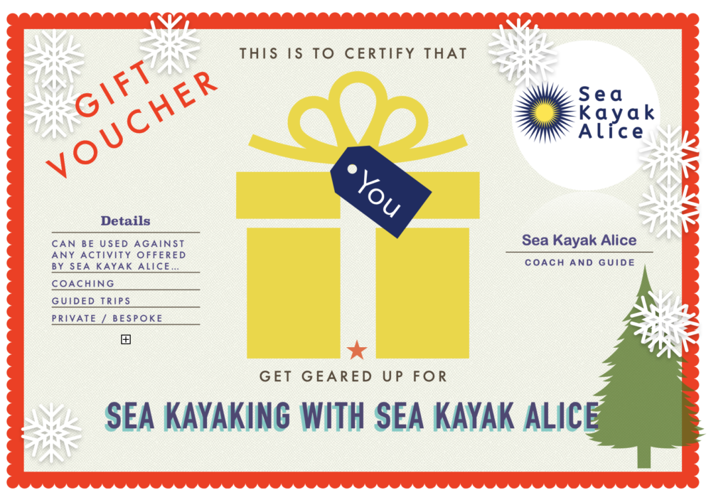The perfect gift for the sea kayaker in your life! Gift Vouchers for Sea Kayak Alice can be bought for any amount or for a specific event. Perfect for birthdays, Christmas, retirement, saying thank you! They are valid for